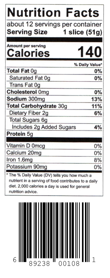 Unbleached unbromated wheat flour (wheat flour, niacin, reduced iron, thiamine mononitrate, riboflavin, folic acid) malted barley flour, filtered water, organic raisins, natural sourdough starter, honey, organic whole wheat flour, oats, sea salt, cinnamon, organic cornmeal.